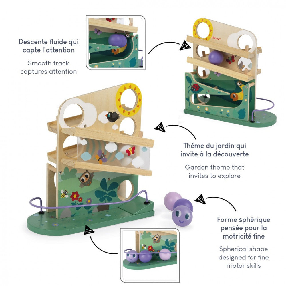 ¡Una oruga cayendo del cielo! Esta pista de bolas de madera ofrece a los más pequeños una fantástica sesión de descubrimiento gracias a un bonito recorrido con los colores del país y sus 3 bolas moradas. ¿Cómo funciona? ¡Niños a partir de 1 año podrán seguir el recorrido de las bolas-oruga que van del sol a las nubes y luego al túnel transparente! Al bajar, sonarán la campana para sorprender a tu bebé antes de aterrizar en el jardín y formar una oruga morada. Este precioso juguete ayudará a tu hijo a desarrollar su agudeza visual mediante el seguimiento, la manipulación y el manejo de objetos esféricos.