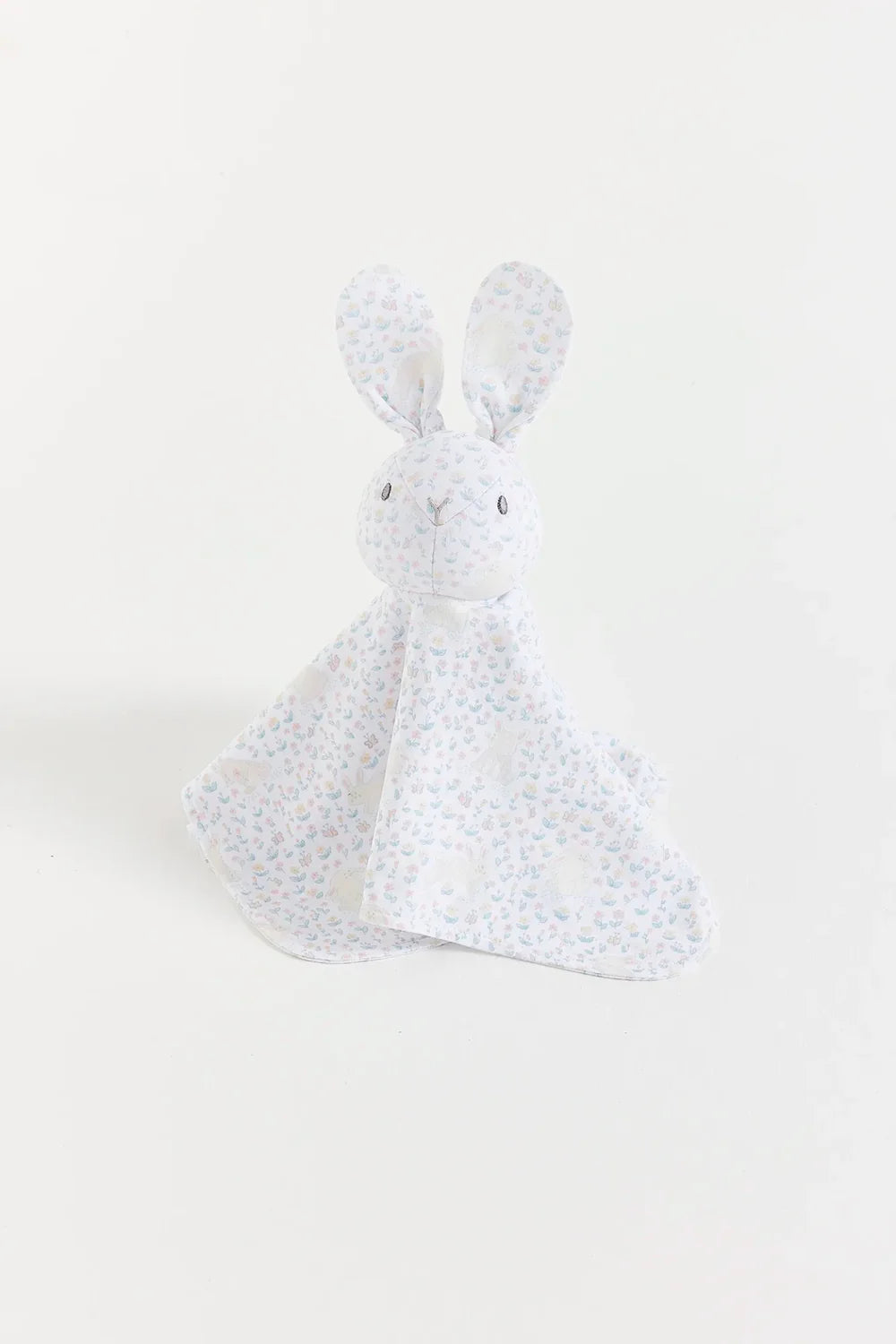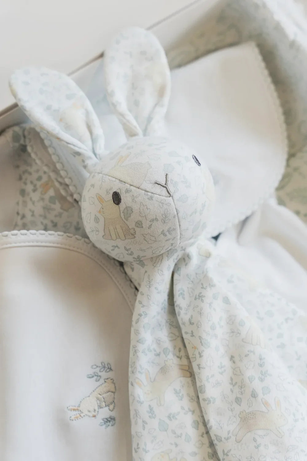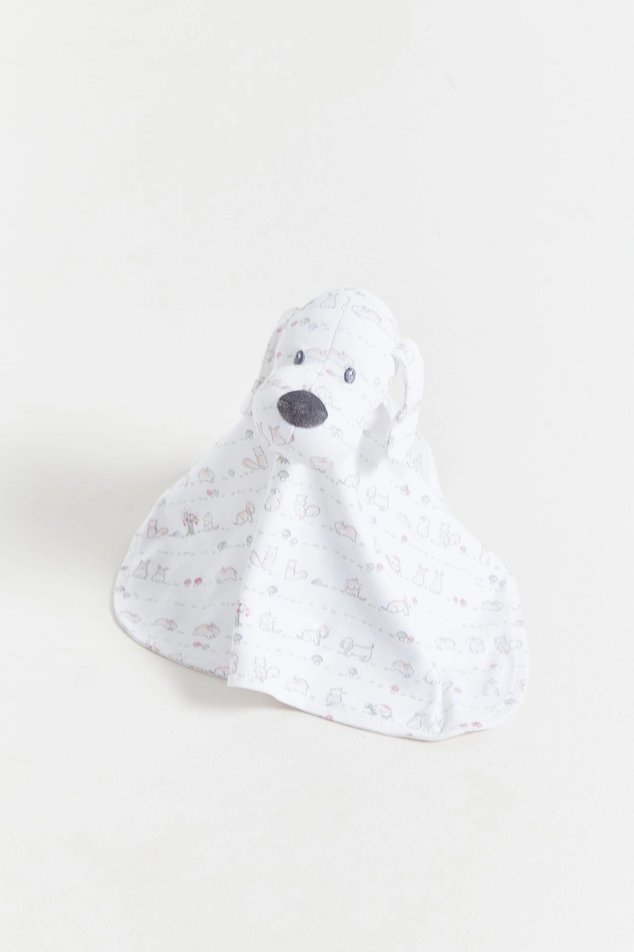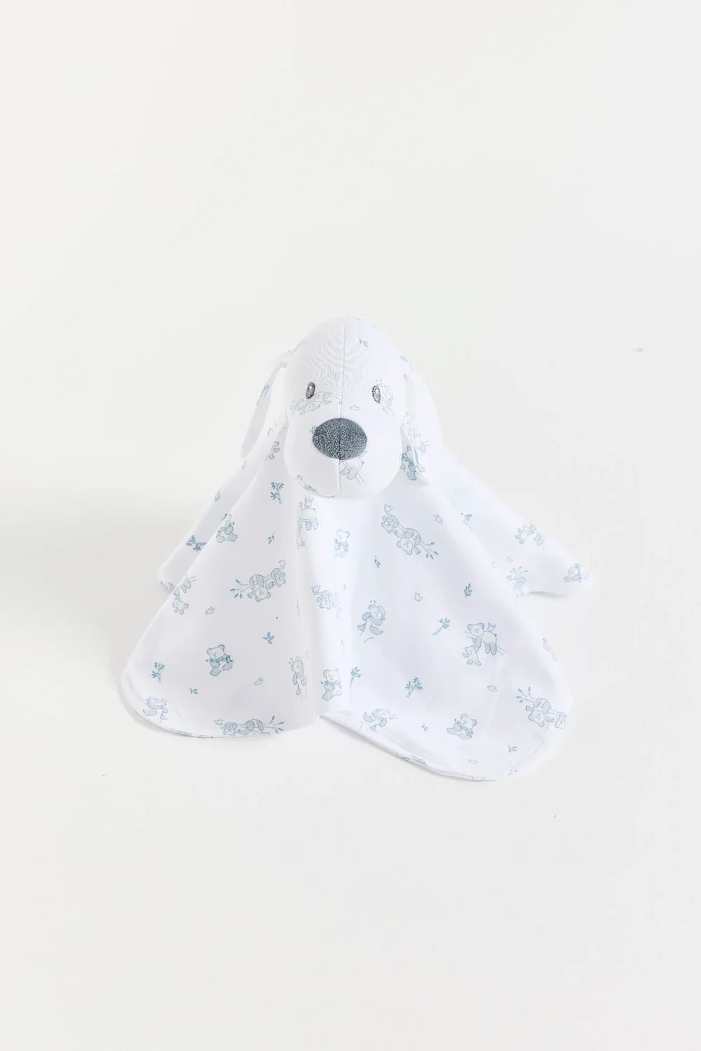 Mantita de apego en interlock algodón pima estampado. Detalle de cara de un perrito en el centro, haciendo de este un muñeco de apego para tu bebe.