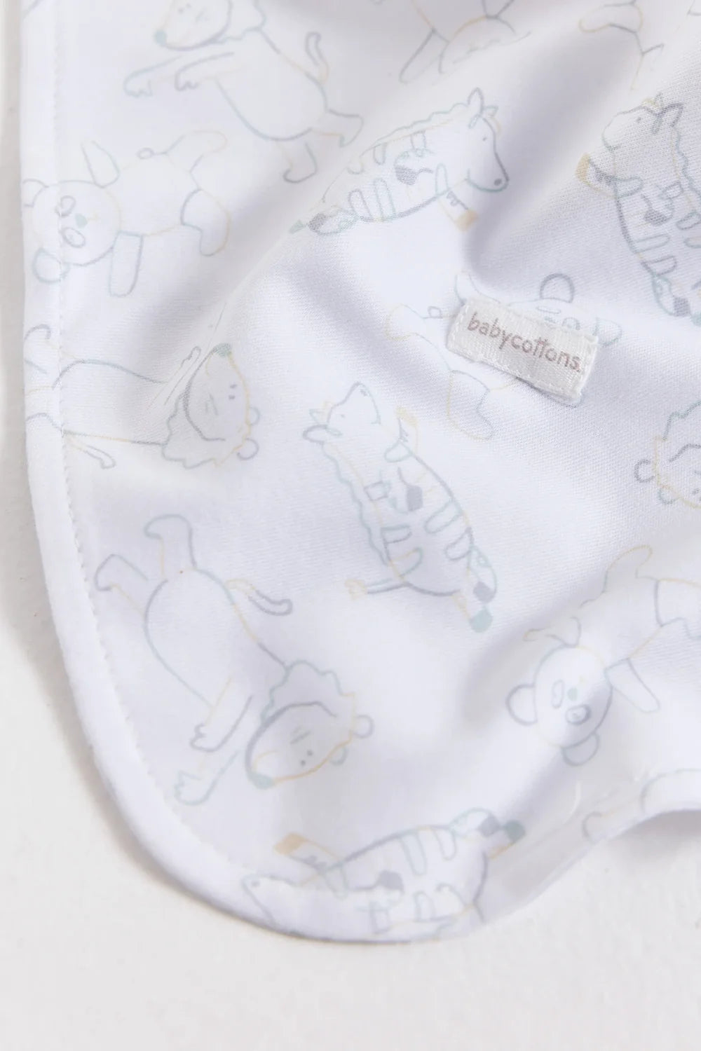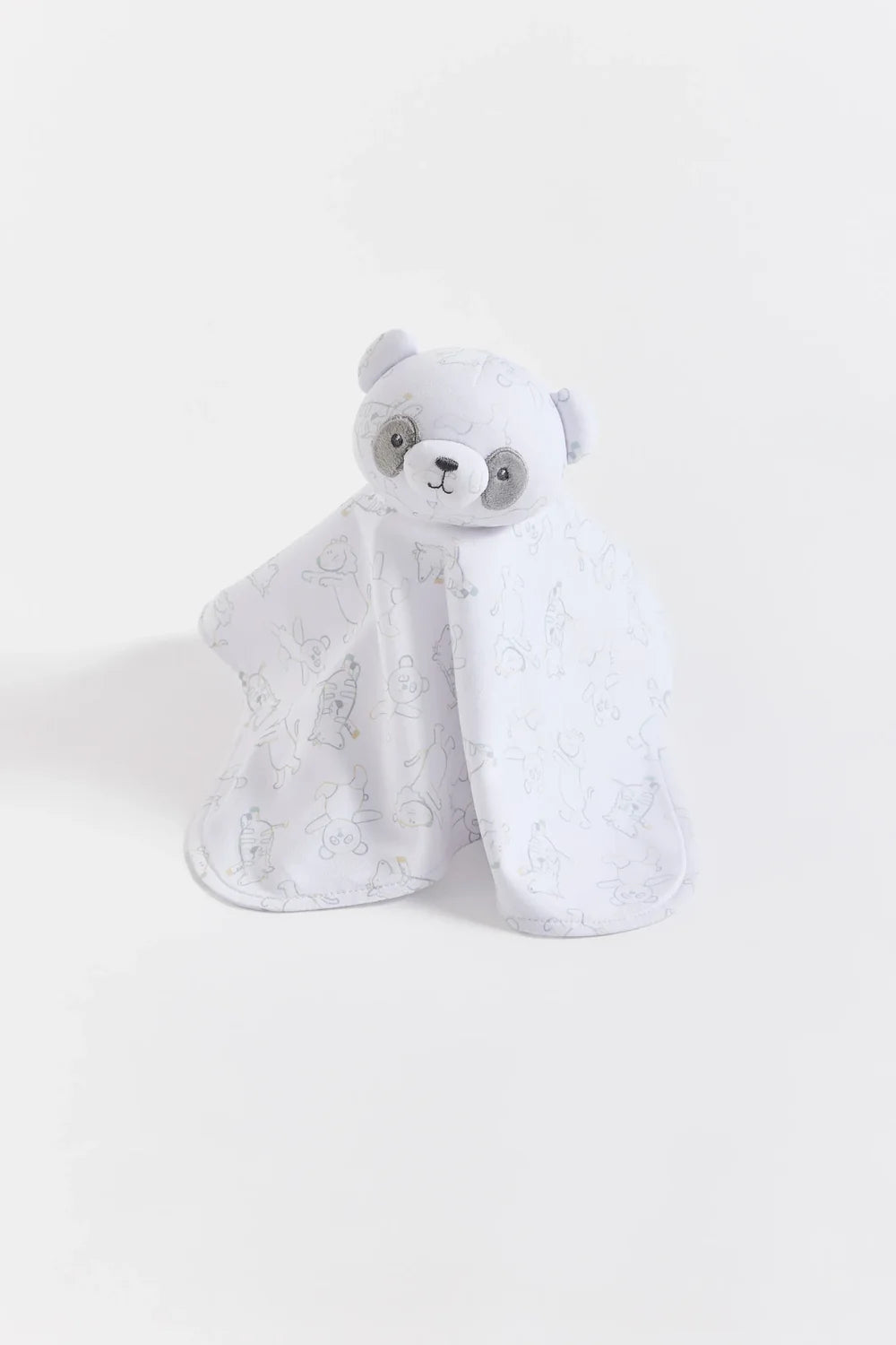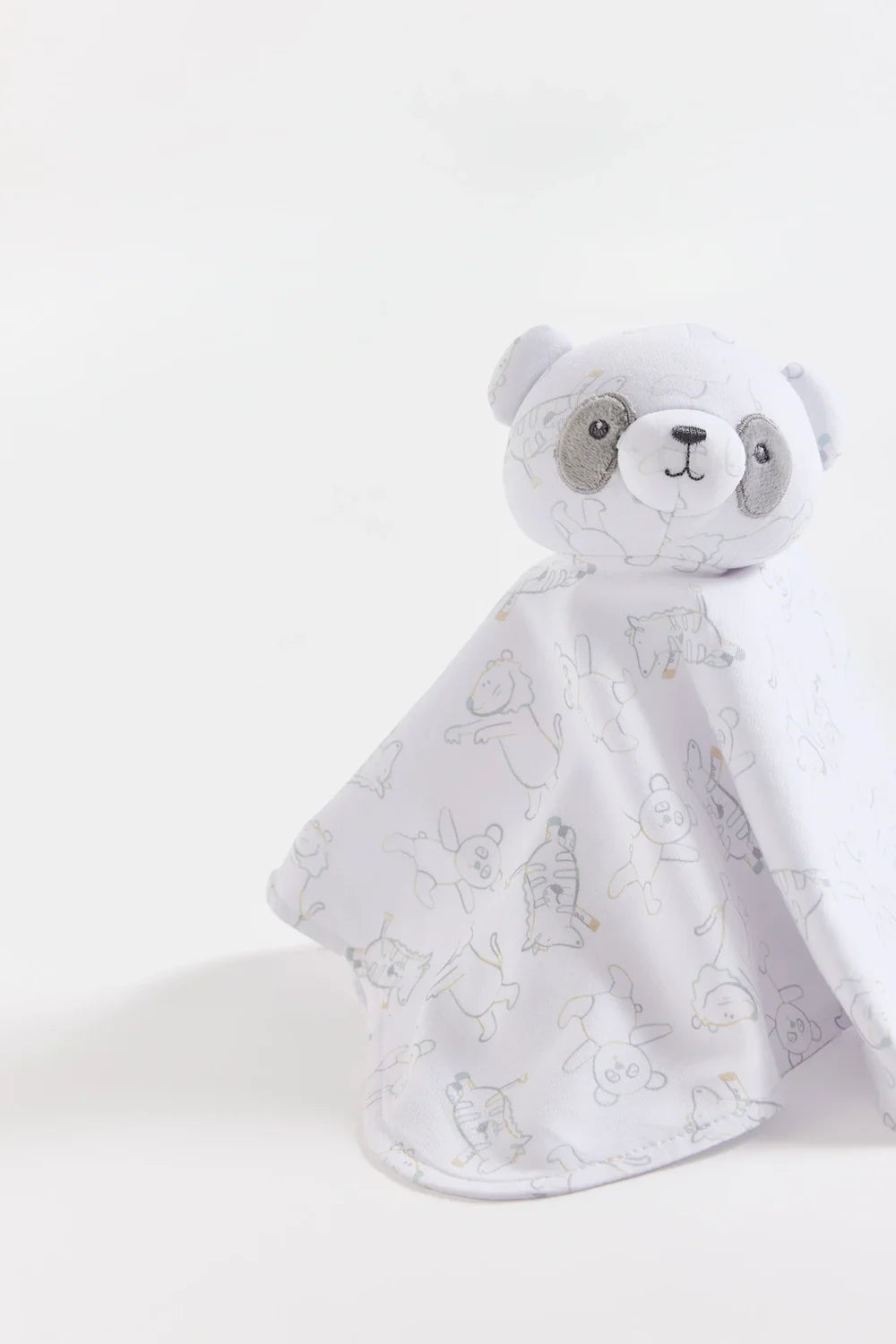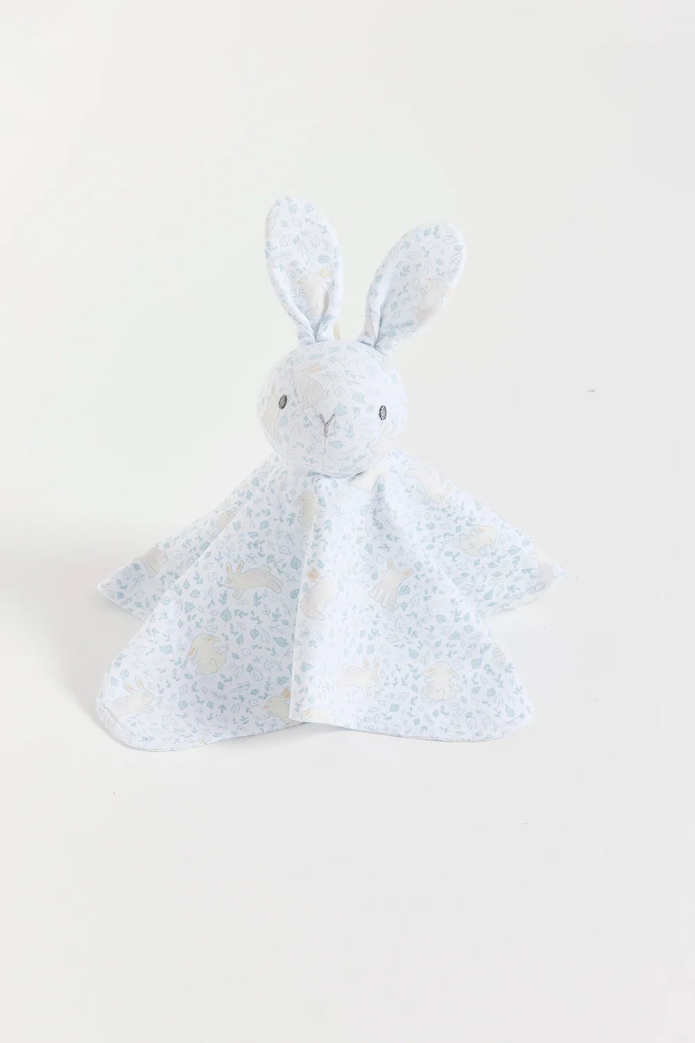 Mantita de apego en interlock algodón pima estampado. Detalle de cara de un perrito en el centro, haciendo de este un muñeco de apego para tu bebe.