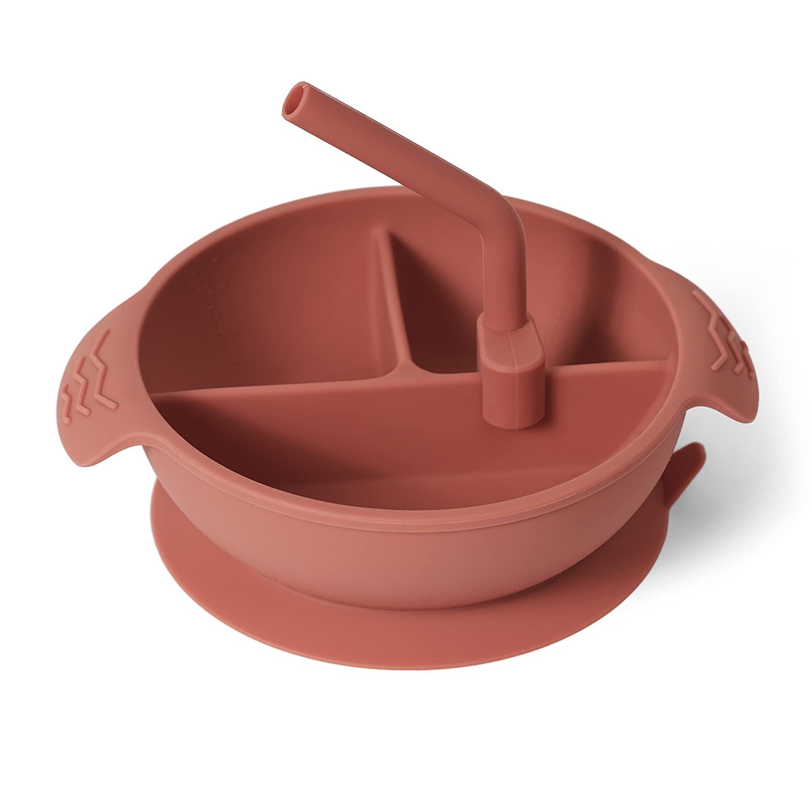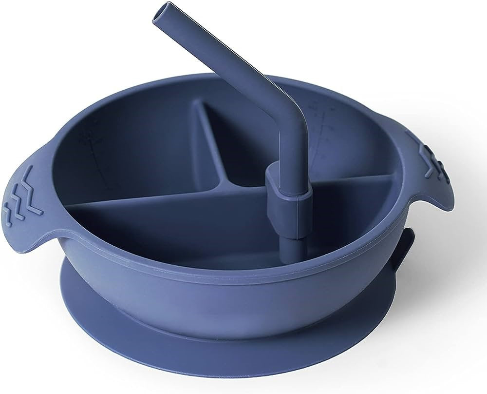 La taza dividida de silicona viene con una pajilla corta de silicona que se puede conectar en cualquiera de las divisiones para permitir que tu hijo beba de los compartimentos.