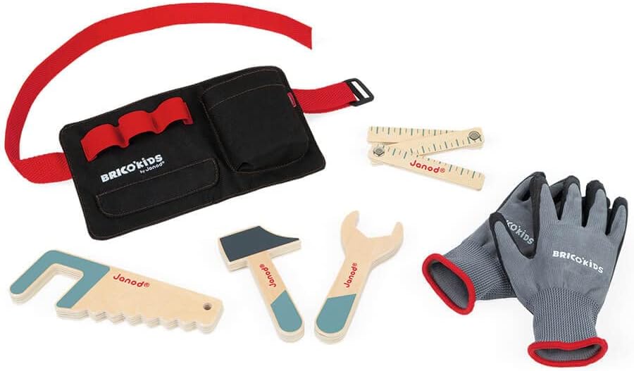 Si quieres hacer grandes cosas, ¡necesitas las herramientas adecuadas! Este fantástico cinturón de bricolaje, con una amplia gama de accesorios, ¡incluye todo lo necesario! Este juguete está hecho de madera y tela, y está diseñado para niños de 3 a 6 años. Para ayudarles a realizar trabajos de alta calidad, el cinturón incluye 4 herramientas de madera (una sierra, un martillo, una llave inglesa y una regla plegable), así como un par de guantes de bricolaje (talla XS). El cinturón se ajusta a cualquier niño. Una vez puesto el cinturón, ¡tu pequeño manitas estará listo para cualquier tarea de la casa!