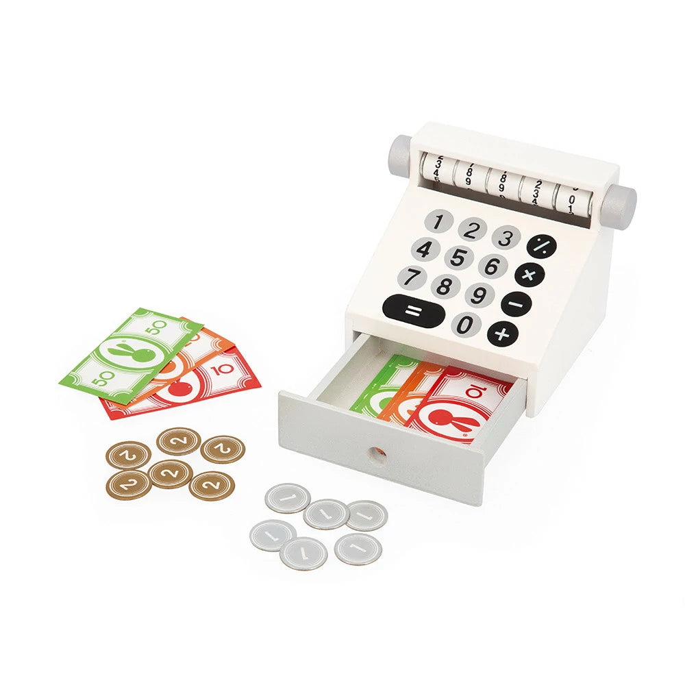 ¡El mercado de pequeños productores ya está abierto! Nuestro Mercado Agrícola de madera es el juguete ideal para niños a partir de 3 años que disfrutarán imaginando que dirigen su propio negocio. Este precioso juguete de imitación está equipado con numerosos accesorios para una experiencia de juego enriquecedora y realista. Un total de 58 accesorios completan este mercado infantil: frutas y verduras frescas (3 zanahorias, 3 patatas, 3 puerros, 3 fresas, 3 manzanas y 3 peras), 5 productos envasados (guisantes, harina, leche, zumo de manzana y queso), el equipamiento esencial de cualquier buen vendedor (1 reloj, 1 báscula, 1 caja con 9 billetes y 12 monedas, 1 pizarra con 2 tizas) y los imprescindibles para una compra exitosa (6 bolsas de papel kraft para envasar frutas y verduras y 2 redes de tela). En los 6 compartimentos de este supermercado de madera, los niños pueden colocar las frutas y verduras como mejor les parezca. Cada compartimento incluye una pizarra donde se puede escribir el precio de cada artículo, ¡para un realismo aún mayor! Los pequeños comerciantes pueden usar el reloj o la pizarra para mostrar el horario de la tienda o las promociones vigentes. Al igual que los adultos, los pequeños pueden envolver las verduras en papel kraft antes de entregárselas a los clientes. Además, se incluyen dos bolsas de malla para regalar a los clientes que hagan la compra: ¡prácticas, reutilizables y muy realistas! Ultrapráctico: las tres pinzas de madera sirven para sujetar bolsas o cualquier otro accesorio del mercado. Este juguete de madera para juegos de imitación animará a los pequeños a inventar un montón de historias y compartirlas con los demás. Además, siempre es interesante aprender a exponer los productos en un estante o a calcular su precio. Gracias a su pequeño puesto de supermercado, los niños pequeños pueden desarrollar sus habilidades sociales y cognitivas, además de su imaginación y vocabulario. Este juguete les ayuda a comprender mejor cómo funciona la compra y la cocina. ¡Les garantizamos muchas horas de diversión mientras esperan a que los clientes compren sus productos locales! Este juguete de simulación está hecho de madera con certificación FSC™