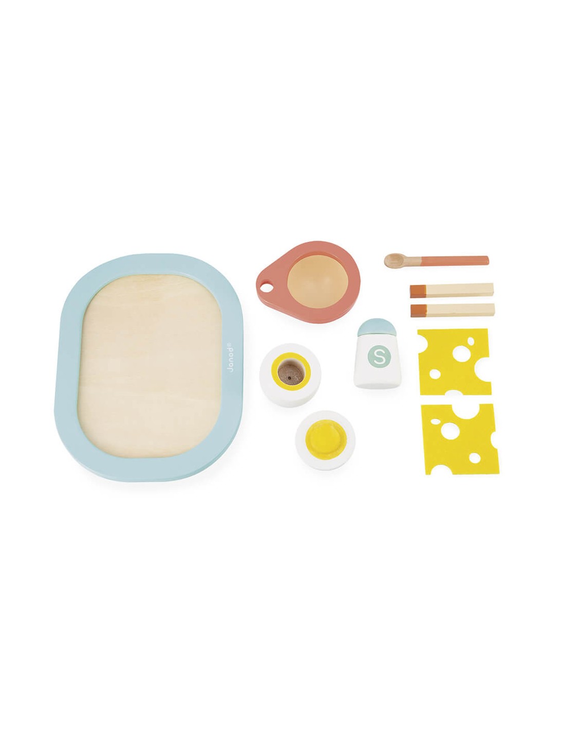En este precioso kit de madera con colores suaves hay todo lo que se necesita para deleitarse: un huevo que se abre con su huevera, dos trozos de pan para mojar en el huevo, dos lonchas de queso hechas de fieltro, una cuchara que se guarda en la huevera, sal y, por supuesto, ¡una bonita bandeja para presentar todo!.