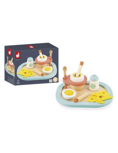 Kit de madera para jugar en la cocina a partir delos tres años . Un bonito juego de vajilla ambientado en el tema del huevo , con el que los niños se divertirán reproduciendo los gestos de las comidas familiares .
